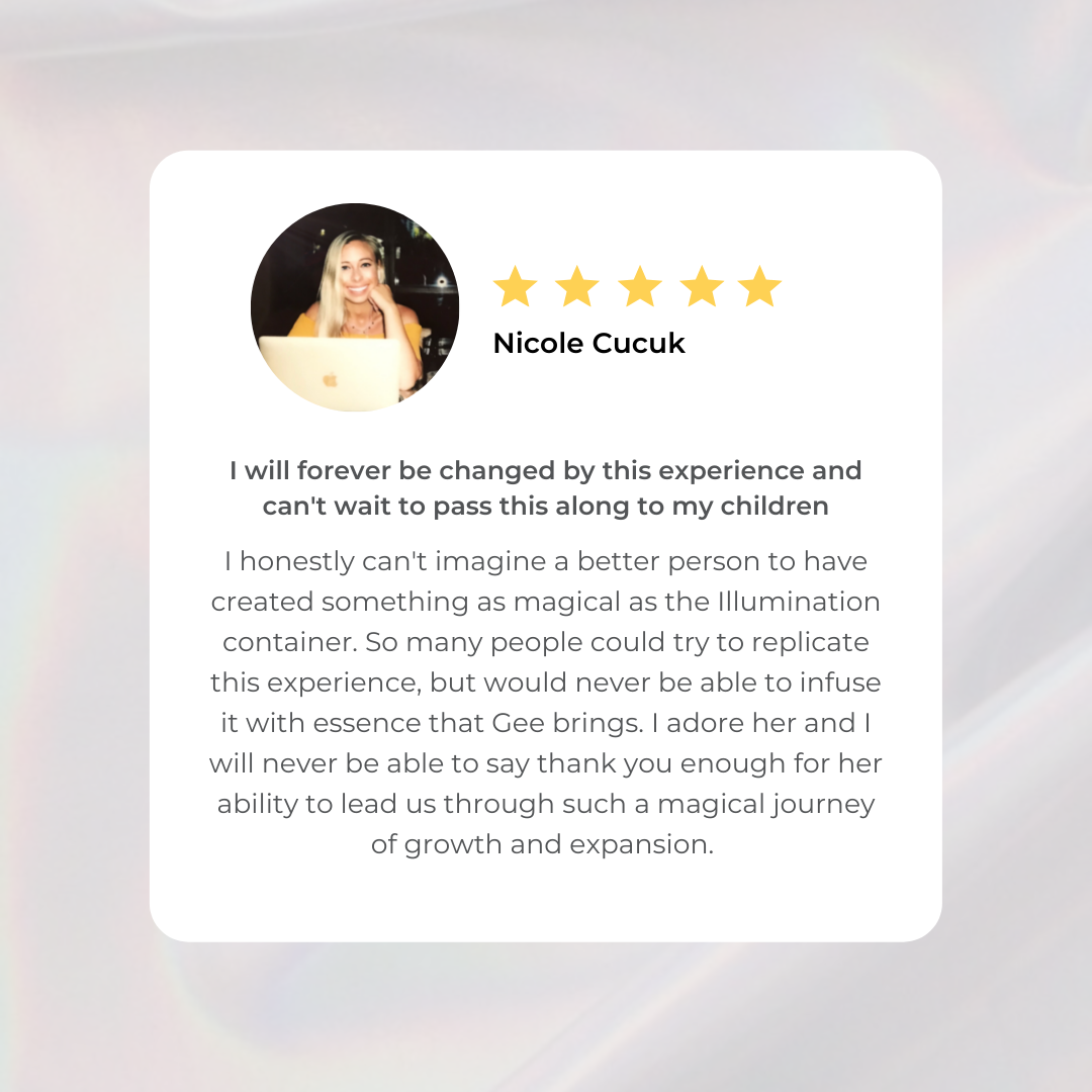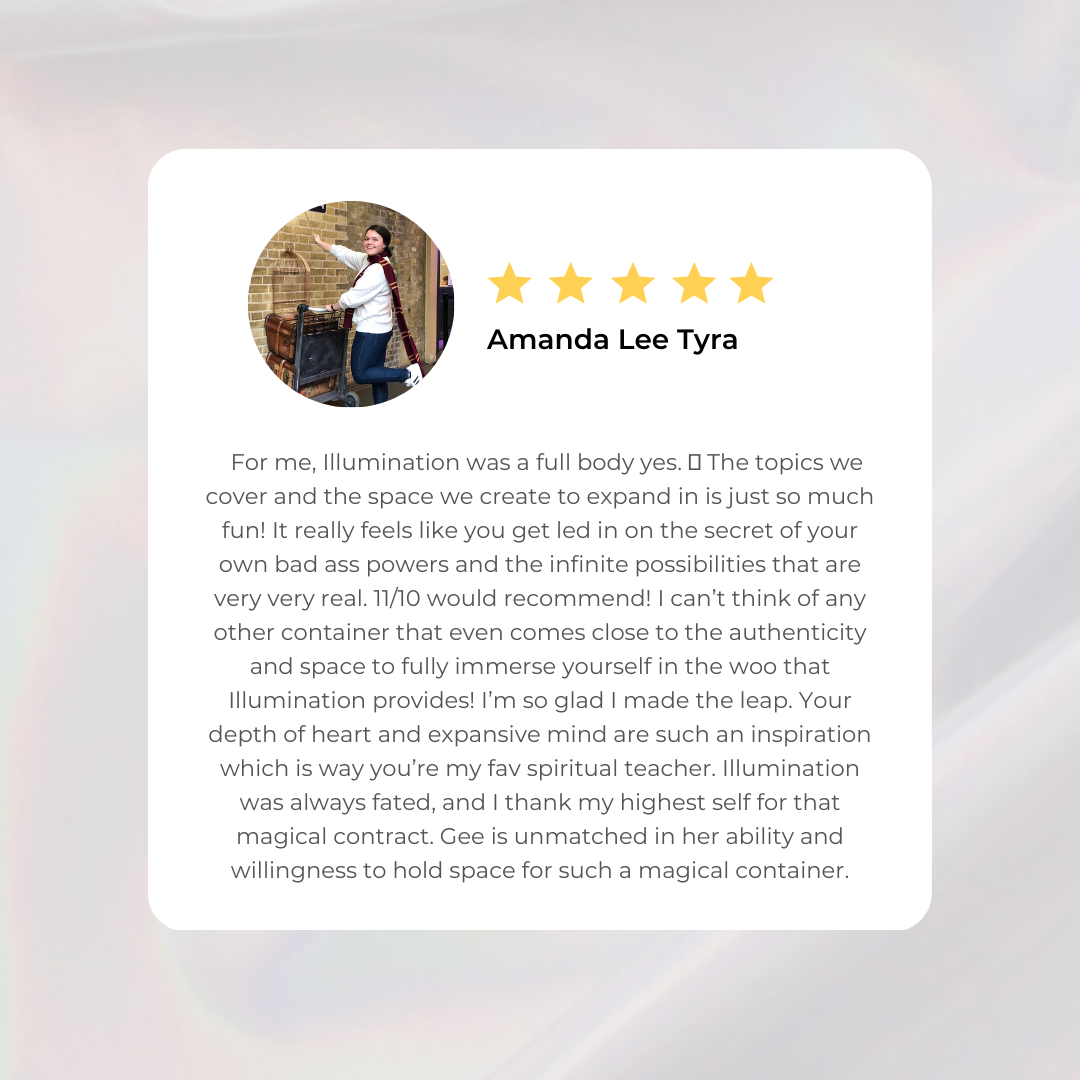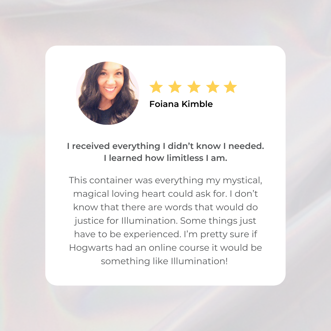 Illumination changed my life, and the lives of all those who have walked through this program. It is the ultimate higher consciousness experience. We play with aliens, angels, Spirit Guides, Quantum Fields, higher dimensions and everything ethereal. As with all experiences, they evolve and they outgrow themselves. This round is unique in two ways. One; it is now a hybrid experience, where level one and level two are now combined and have become one long intimate experience - hence why we are now called Illumination The Experience. So post container, you have the choice to automatically join The Elohim Group (our intuitive medicine space) if you choose to. And two; that it is the final round of this container. The content is rich and juicy and expansive, but holding this space requires a lot of focus and dedication on my end, and so I wanted to offer it one last time before I step into new spaces.